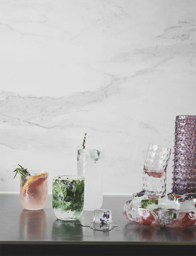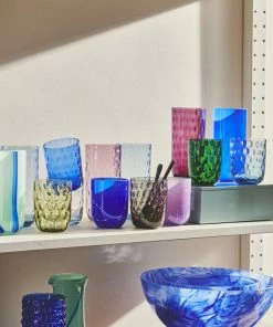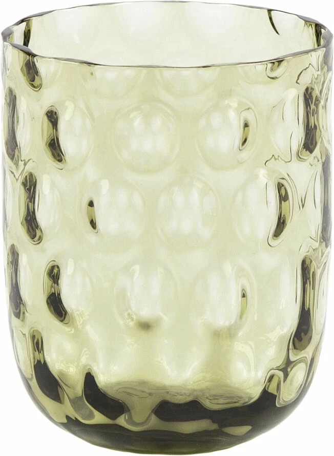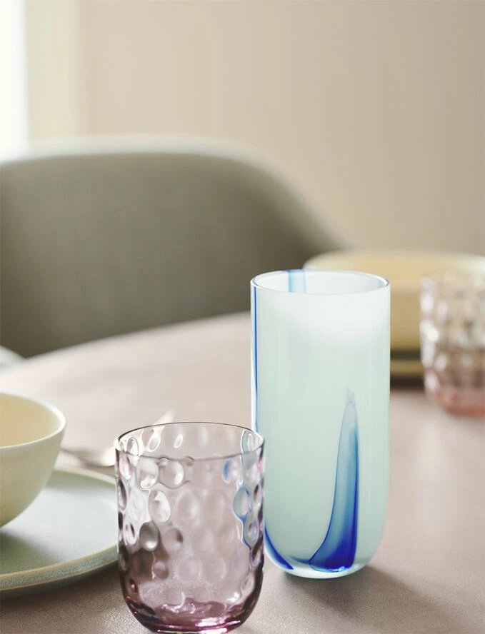 Danish Summer Tumbler med et mønster af store dråber kan både indeholde kolde og lune drikke, bruges til skriveredskaber eller til opbevaring af småting. Hver enkelt glas er mundblæst og afrundet i træform, så selvom alle produkter har sin egen unikke og varierende farve og mønster, er alle glas samme størrelse. Farverne er udvalgt og udviklet specielt til Danish Summer kollektionen og giver mulighed for at skabe et personligt udtryk, som tiltaler dig. Hvad enten du indretter med et legende farvespil eller tone-i-tone nuancer.