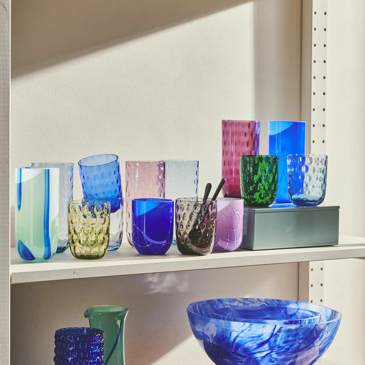 Danish Summer Tumbler med et mønster af små dråber kan både indeholde kolde og lune drikke, bruges til skriveredskaber eller til opbevaring af småting. Hver enkelt glas er mundblæst og afrundet i træform, så selvom alle produkter har sin egen unikke og varierende farve og mønster, er alle glas samme størrelse.