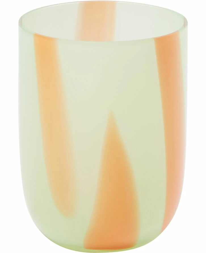 Flow Tumbler med et mønster af små dråber kan både indeholde kolde og lune drikke, bruges til skriveredskaber, som potteskjuler eller til opbevaring af småting. Hver enkelt glas er mundblæst og afrundet i træform, så selvom alle produkter har sin egen unikke og varierende farve og mønster, er alle glas samme størrelse. Farverne er valgt ud fra en legende tilgang til indretning med brug af knust glas og stofrester, der i processen udvikler sig til striber, prikker eller et grafisk mønster. Vores ønske er, at Flow skaber glæde og bliver en æstetisk, farverig og kunstnerisk tilføjelse til boligen.