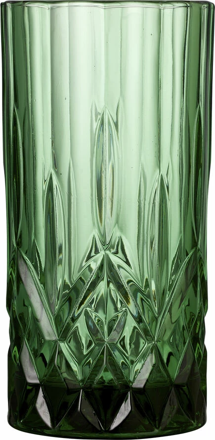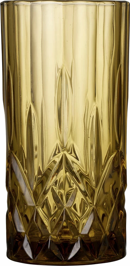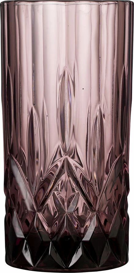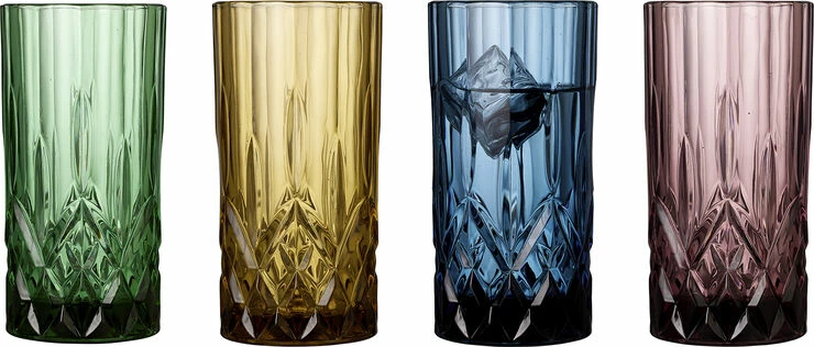 4 stk. highballglas, 38 cl, i gennemfarvet glas i fire flotte farver, amber, grøn, blå og pink. Det smukke design med flotte facetter lader lyset spille i både glas og indhold og løfter sanseoplevelsen, uanset om du nyder vand, juice eller en longdrink.