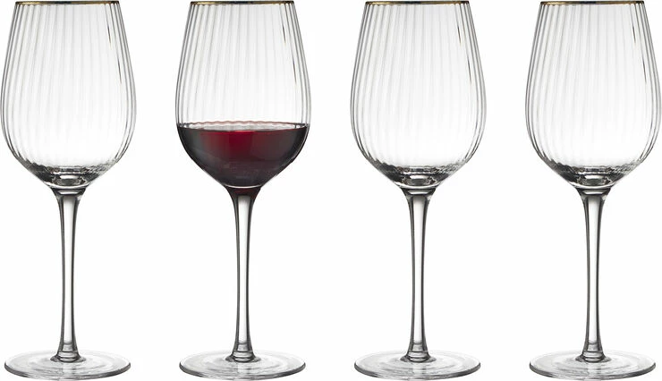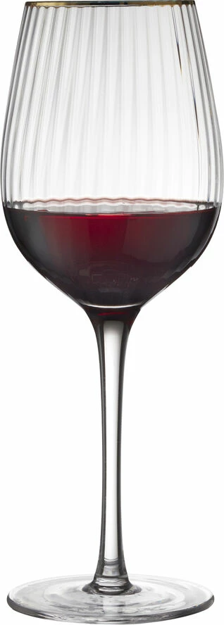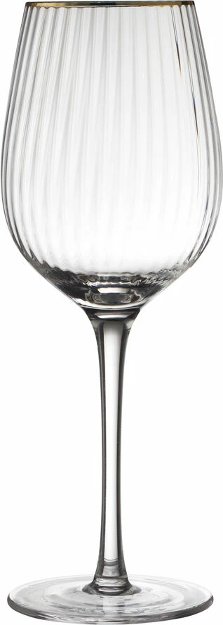 Smukt vinglas med bløde, rundede former. Det elegante, riflede design med en fin guldkant giver glasset et flot vintagelook, der samtidig afspejler tidens trends. Server din bedste vin i glasset og lad de fine facetter reflektere lyset og glassets indhold på smukkeste vis. 40 cl