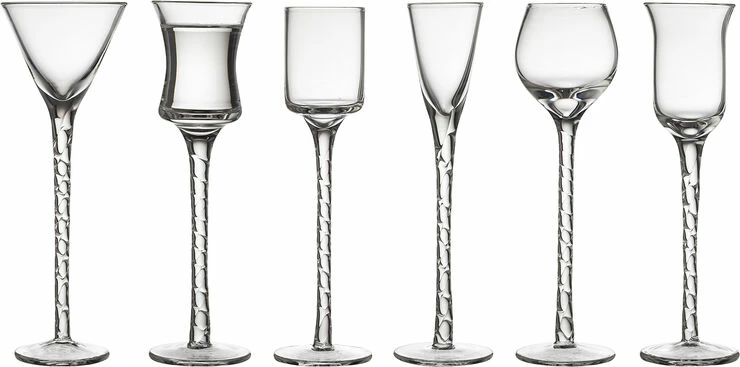 6 forskellige mundblæste snapseglas med snoet stilk bidrager til en god stemning ved bordet, og det er nemt at finde sit eget glas. Snapseglassene i klart glas har forskellige udformninger og indeholder fra 2,5 op til 5 cl. H 18 cm.