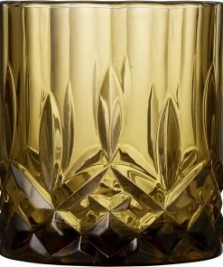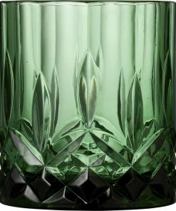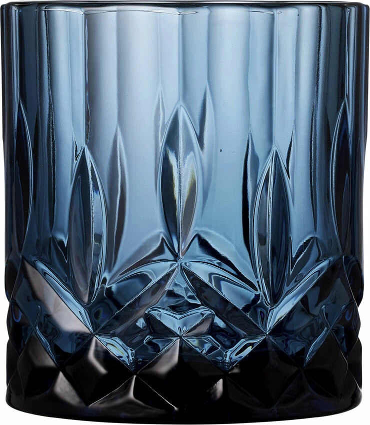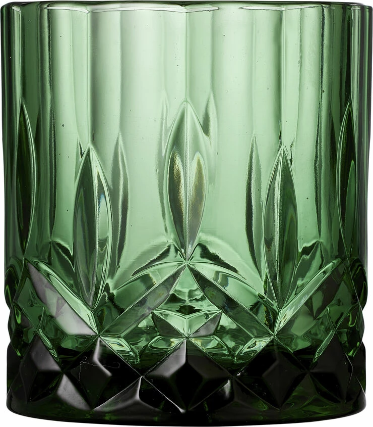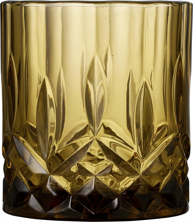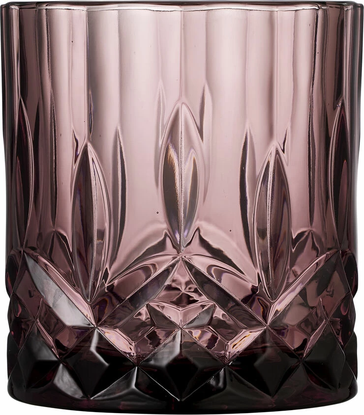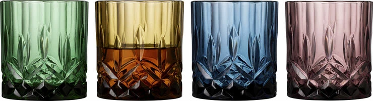 4 stk. whiskyglas, 32 cl, i gennemfarvet glas i fire flotte farver, amber, grøn, blå og pink. Det smukke design med flotte facetter lader lyset spille i både glas og indhold og løfter sanseoplevelsen, uanset om du nyder vand, juice eller din bedste whisky.