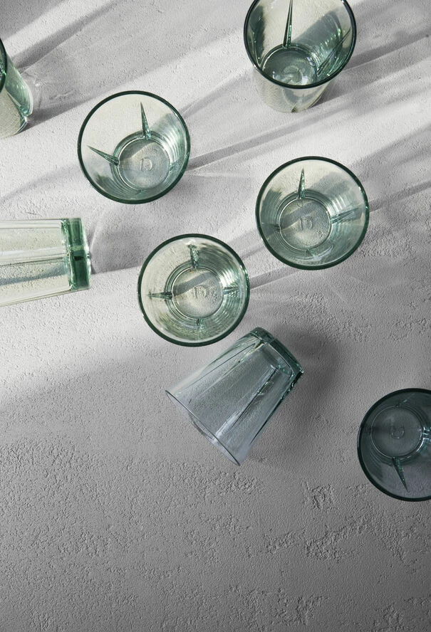 En fornyelse af de kendte klassikere i tidens ånd, Grand Cru Recycled er skabt i 100% genbrugsglas af den bedste kvalitet, som med god samvittighed kan sættes på bordet. Glasset har en svag blågrøn tone, der kendetegner genbrugsglas, farven kan variere en smule afhængig af det glas, der genbruges og vidner om glassets forhistorie. I serien findes et nyt glas som rummer 26 cl, desuden det velkendte Cafeglas, som også kan bruges til varme drikke og den lille skål som egner sig perfekt til morgenmad og servering. Funktionaliteten og brugsværdien er som vi kender den, Glassene er både stabelbare og tåler opvaskemaskine perfekt til hverdagsbrug. Grand Cru Recycled er et af mange nye tiltag, der lanceres under konceptet Rosendahl Reduce, som er den samlede betegnelse for kvalitetsprodukter med fokus på cirkularitet og C02-reduktion. Kig efter det lille cirkulære emblem så er det nemt at vælge bæredygtigt i Rosendahls sortiment.